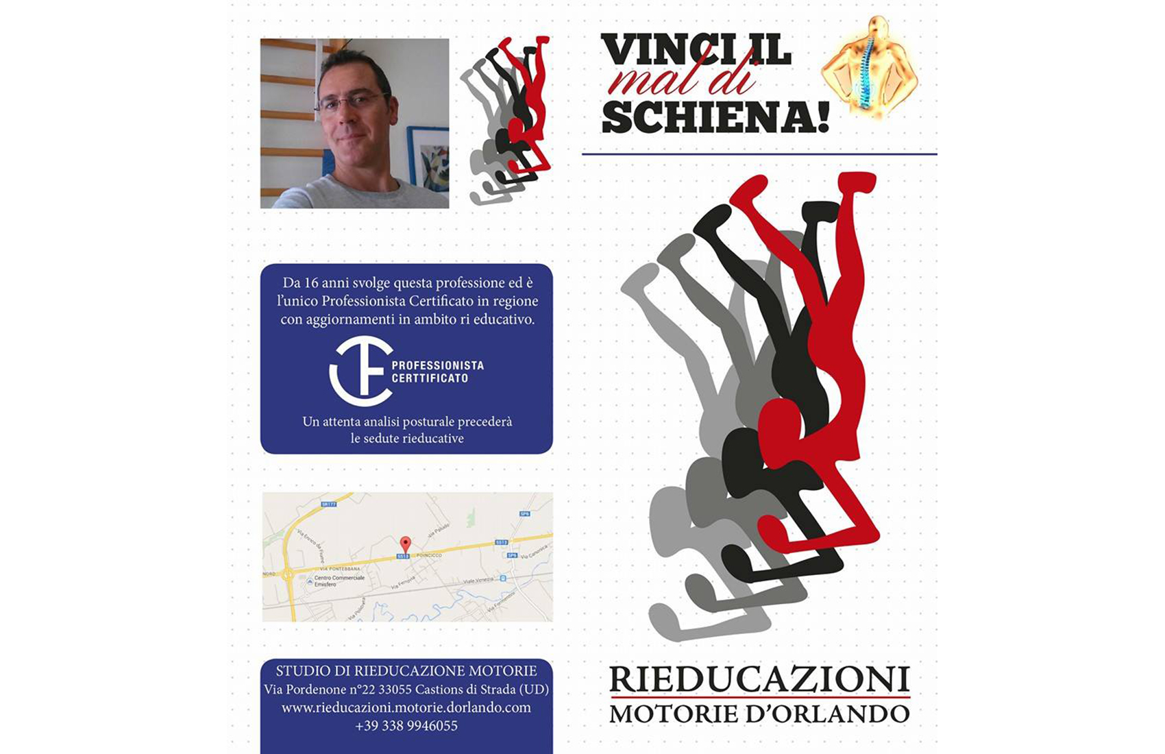 Il Dott. D'Orlando è l'unico chinesiologo clinico certificato in Friuli ed opera da oltre vent'anni nello STUDIO DI RIEDUCAZIONI MOTORIE a Castions di Strada.