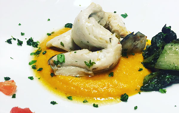 Esempi di piatti proposti: risotto mazzancolle e puntarelle, baccalà mantecato su polentina, pesce spada con pomodorini e patate, tiramisù.