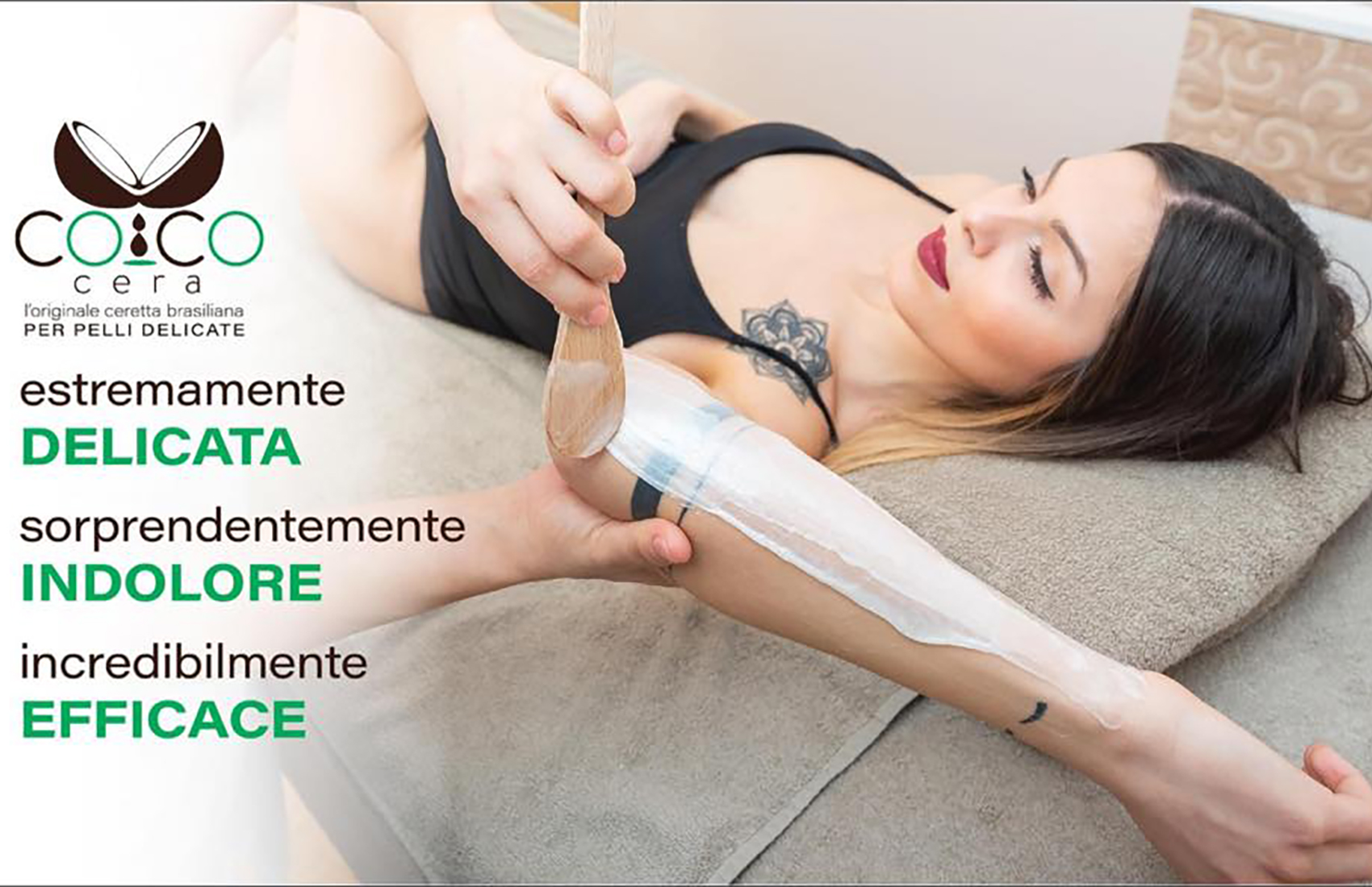 Il trattamento di epilazione non é mai stato così piacevole: la pelle viene preparata con un detergente delicato, trattata con una speciale polvere a base di amido di riso per rendere lo strappo ancora meno fastidioso, lo stesso viene eseguito con una miscela di resine naturali con un fantastico aroma di cocco e alla fine viene applicata una crema speciale ad azione lenitiva ed idratante: il risultato sarà una pelle liscia, senza arrossamenti, perfettamente asciutta senza residui appiccicosi.
